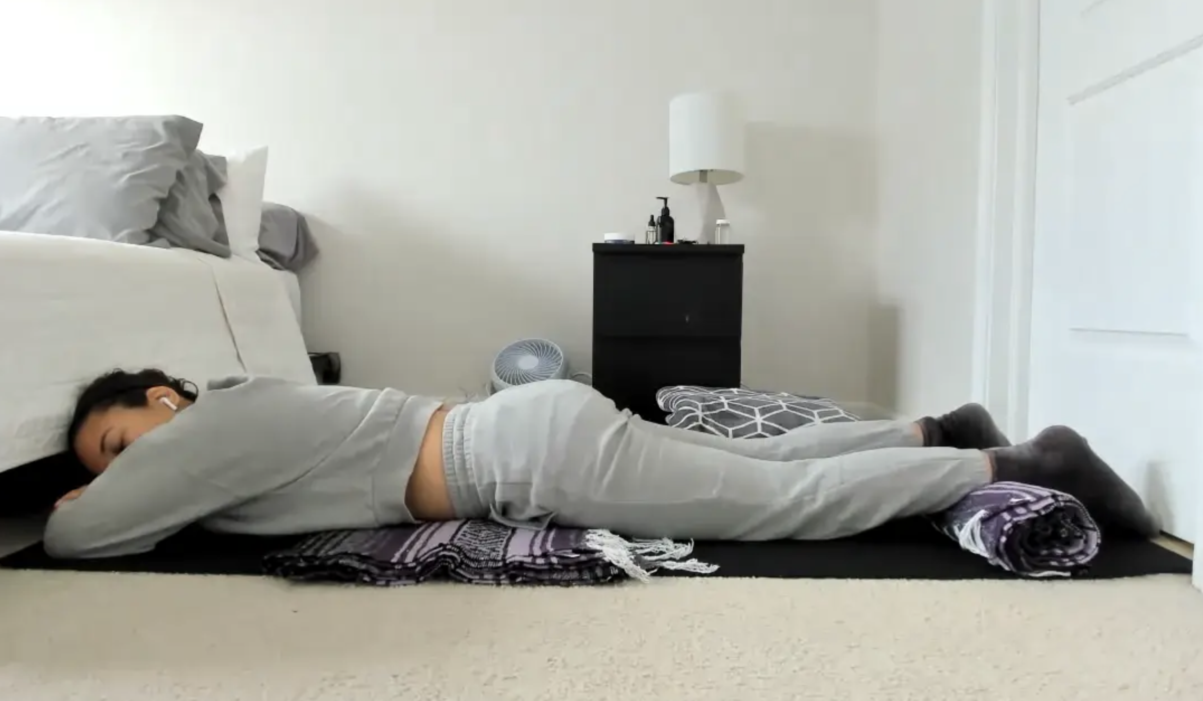 You will need three to four blankets, three to four bed pillows, and something to cover your eyes.